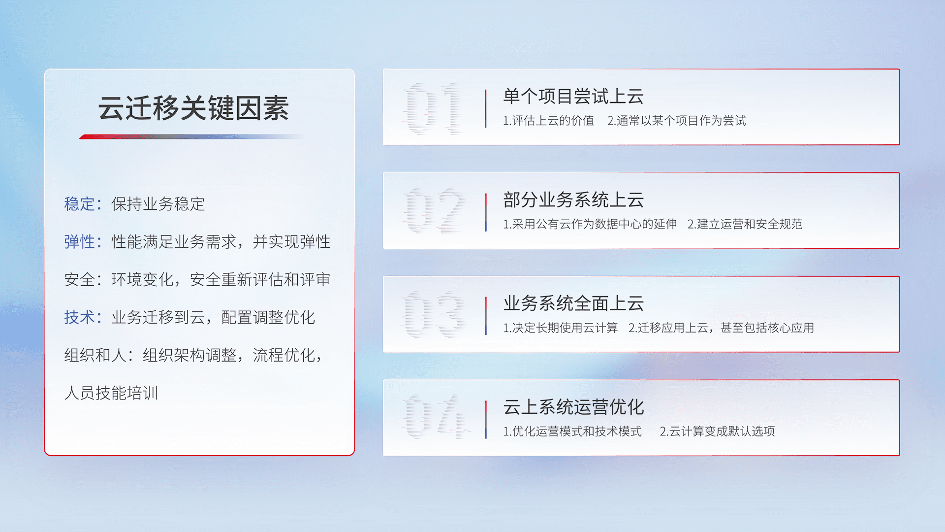 结合实际业务,,,从规划设计、、云平台选型、、、云原生改造、、、数据迁移、、、、集成交付,,迁移全过程为客户识别最佳上云路径,,做好风险识别管理,,,,设计网络架构、、、身份权限、、、、安全审计合规、、操作审计、、、日志审计、、监控告警策略、、、、多站点容灾设计等,,对云上基础设施进行整体规划,,,提升IT治理水平,,,,以满足弹性、、、高可用、、高性能的需求。。。