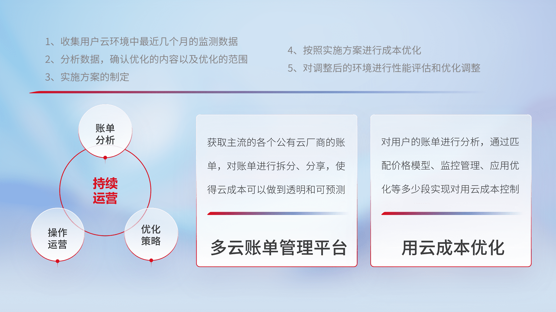 通过多云纳管,,,以统一的资源数据模型把客户的云资源进行抽象和封装,,进而实现对多云资源的统一操作,,,,保障云资源管理的可靠性、、、、稳定性与可用性。。。。量身定制化运维内容,,配置、、开发运维、、、、补丁管理、、、备份、、监控、、认证和访问管理、、、、审计和日常巡检等,,保障在用云过程中的可靠度,,稳定度以及高可用率。。。。